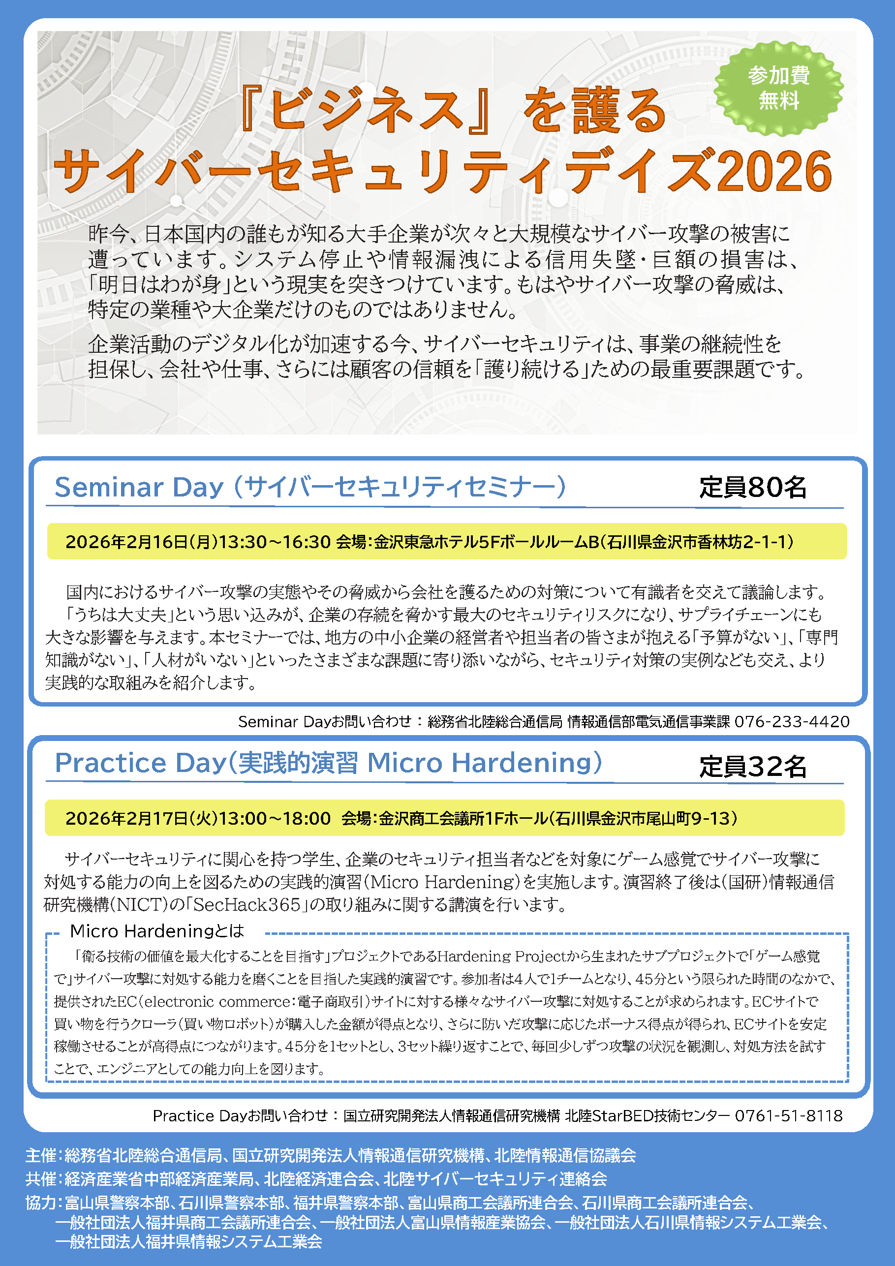 北陸情報通信協議会は、総務省北陸総合通信局、国立研究開発法人情報通信研究機構など関連する組織・団体等との共催により、サイバーセキュリティに関するイベント「『ビジネス』を護るサイバーセキュリティデイズ2025」を開催します。 |