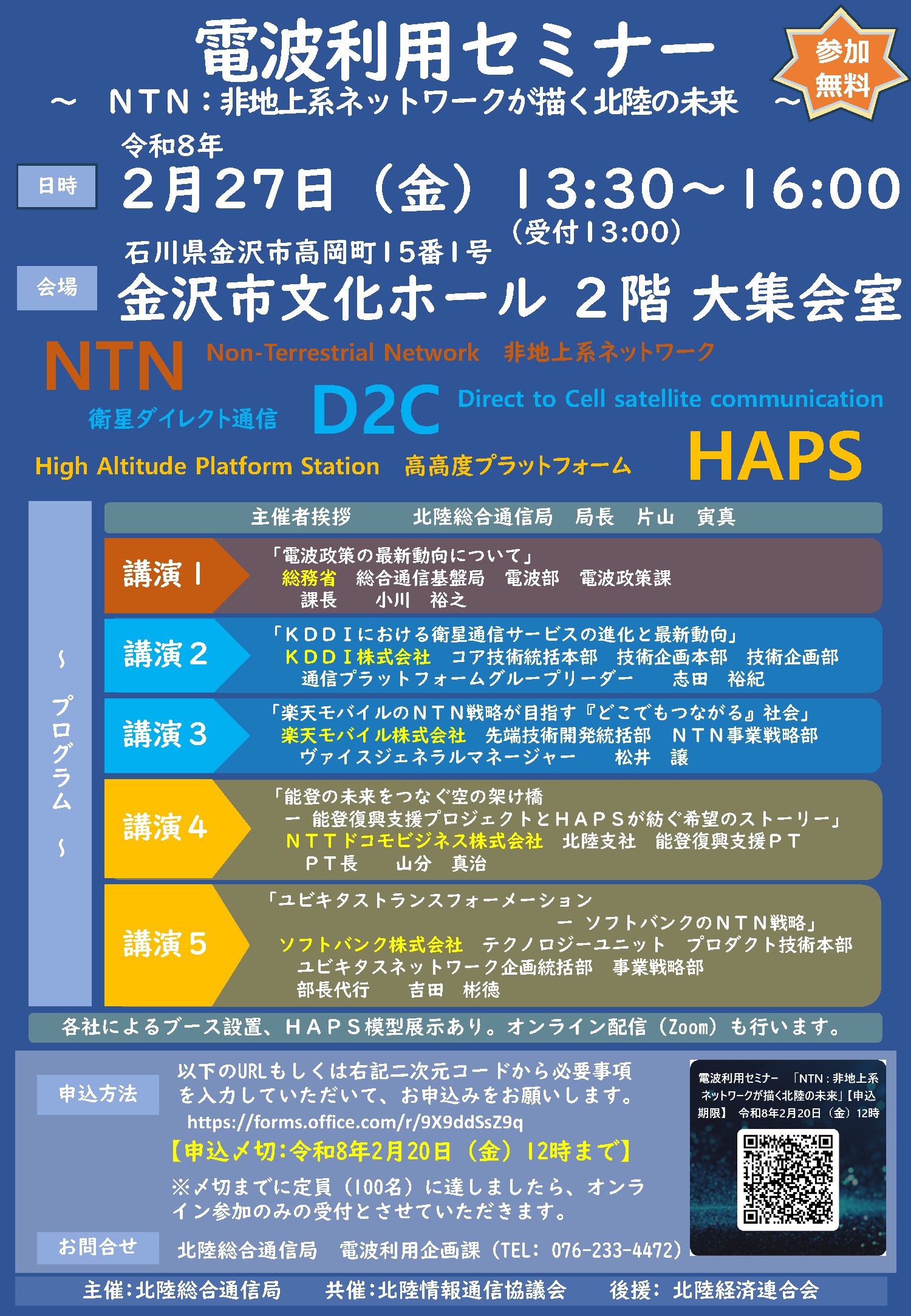 電波利用セミナー「NTN:非地上系ネットワークが描く北陸の未来」を開催!北陸情報通信協議会は、総務省北陸総合通信局との共催により、電波利用セミナー「NTN:非地上系ネットワークが描く北陸の未来」を下記のとおり開催します。本セミナーは、衛星ダイレクト通信や高高度プラットフォーム(HAPS)など非地上系ネットワークの技術動向やその利活用について理解を深めていただくことを目的に開催するものです。 ※詳細は左欄の案内チラシをご覧ください。 1 日時 令和8年2月27日(金)13:30~16:00(開場13:00予定) 2 会場 金沢市文化ホール 2階 大集会室(石川県金沢市高岡町15番1号) 3 内容 講演1 「電波政策の最新動向について」 講師 総務省総合通信基盤局 電波部 電波政策課 課長 小川 裕之 講演2 「KDDIにおける衛星通信サービスの進化と最新動向」 講師 KDDI株式会社 コア技術統括本部 技術企画本部 技術企画部 通信プラットフォームグループリーダー 志田 裕紀 講演3 「楽天モバイルのNTN戦略が目指す『どこでもつながる』社会」 講師 楽天モバイル株式会社 先端技術開発統括部 NTN事業戦略部 ヴァイスジェネラルマネージャー 松井 譲 講演4 「能登の未来をつなぐ空の架け橋 ― 能登復興支援プロジェクトとHAPSが紡ぐ希望のストーリー」 講師 NTTドコモビジネス株式会社 北陸支社 能登復興支援PT PT長 山分 真治 講演5 「ユビキタストランスフォーメーション ―ソフトバンクのNTN戦略」 講師 ソフトバンク株式会社 テクノロジーユニット プロダクト技術本部 ユビキタスネットワーク企画統括部 事業戦略部 部長代行 吉田 彬徳 4 会場定員 100名 5 参加費 無料 6 申込方法 以下の申し込みフォームからお申し込みください。 ・申込フォーム:https://forms.office.com/r/9X9ddSsZ9q ※案内チラシの二次元コードからもお申し込みいただけます。 ・申込期限:令和8年2月20日(金)12時まで |
